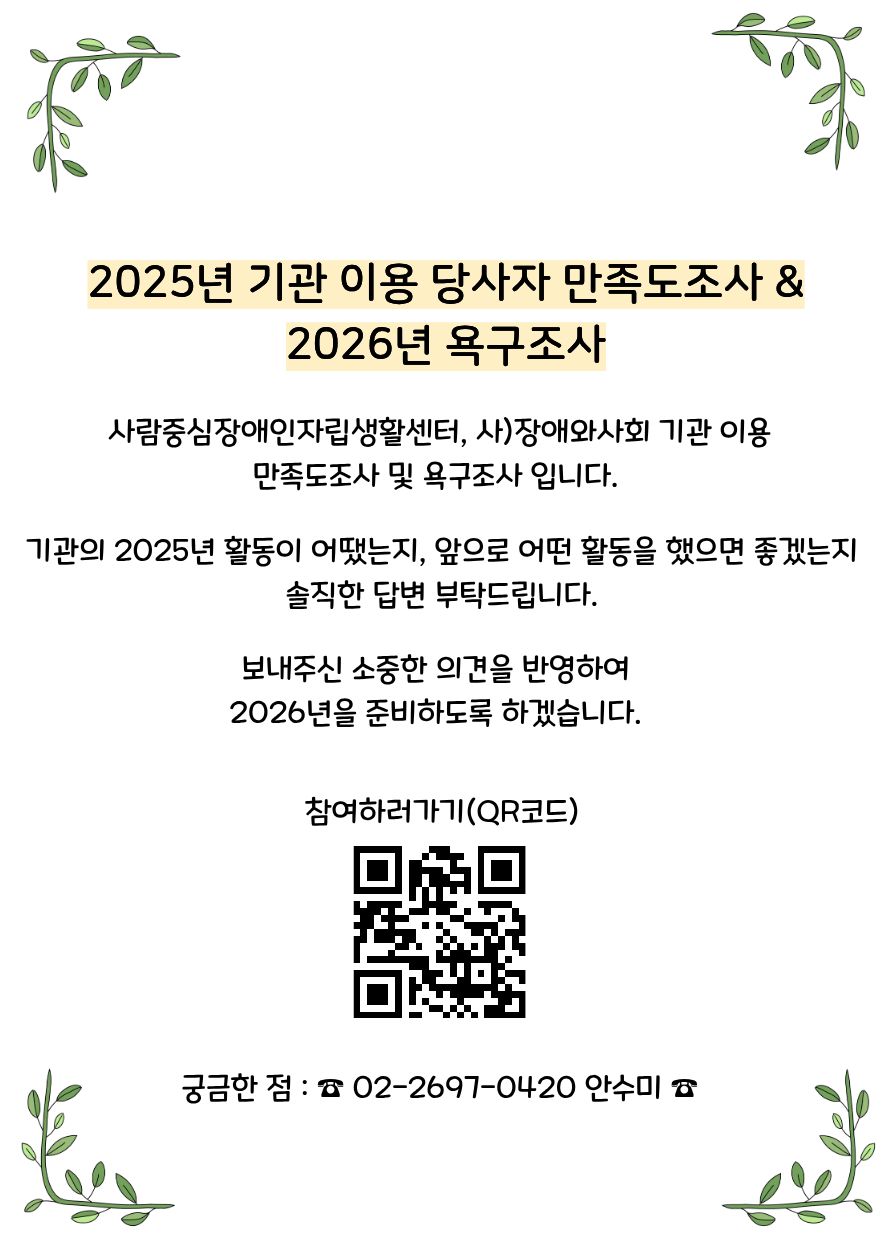 안녕하세요? 사람중심장애인자립생활센터입니다. 우리 기관에서는 2025년 기관 이용 만족도조사 및 2026년 욕구조사를 진행합니다. 기관의 2025년 활동이 어땠는지, 앞으로 어떤 활동을 했으면 좋겠는지 솔직한 답변 부탁드립니다. 보내주신 의견을 반영하여 2026년을 준비하도록 하겠습니다. 감사합니다.