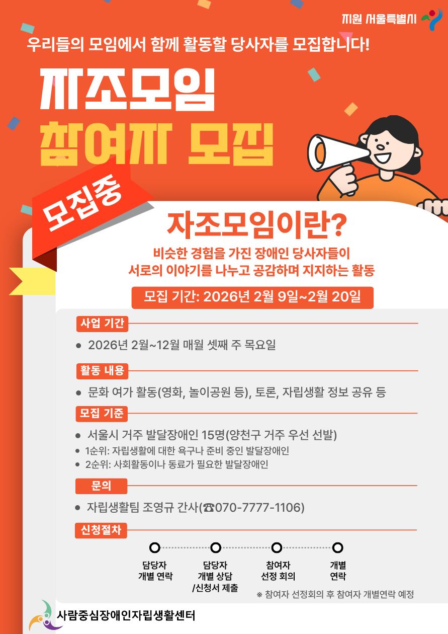 발달장애인당사자들이 주체적으로 모임을 기획하고 운영하는 자조모임 '우리들의 모임'의 구성원을 아래와 같이 모집하오니 많은 신청 바랍니다.