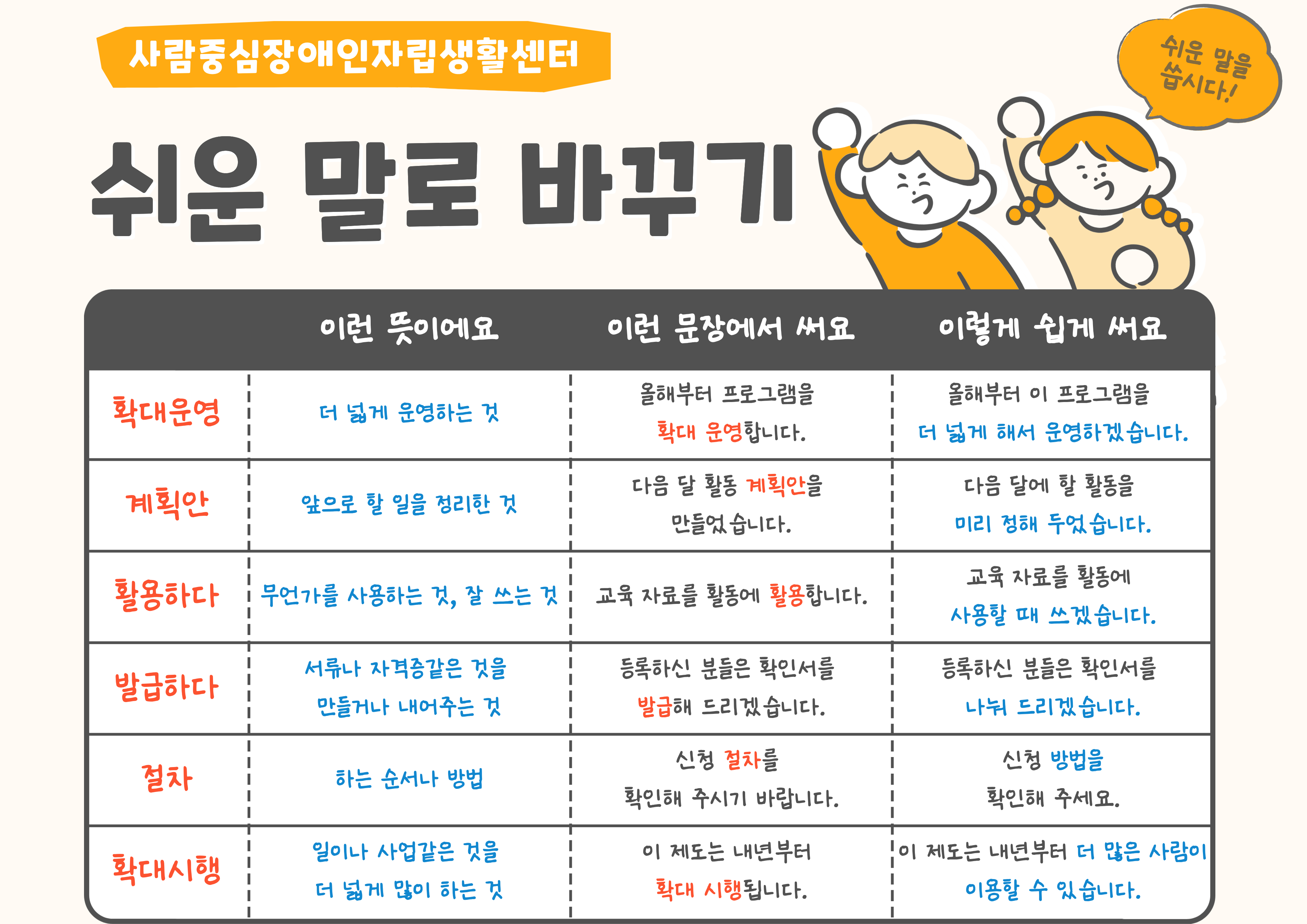 저희 센터에서 쉬운 말 탐험대로서 어려운 말들을 쉬운 말로 바꾸고, 문장도 쉽게 바꿔봤습니다.