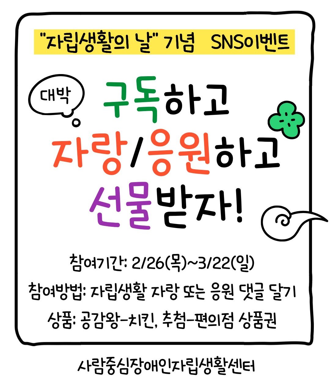 다가오는 3월 6일 '자립생활의 날'을 기념하여 SNS이벤트를 진행합니다.
