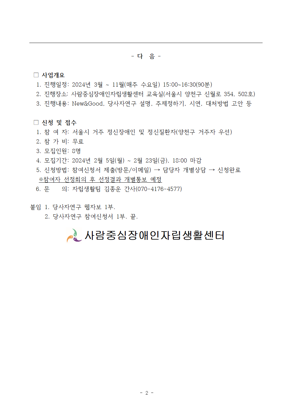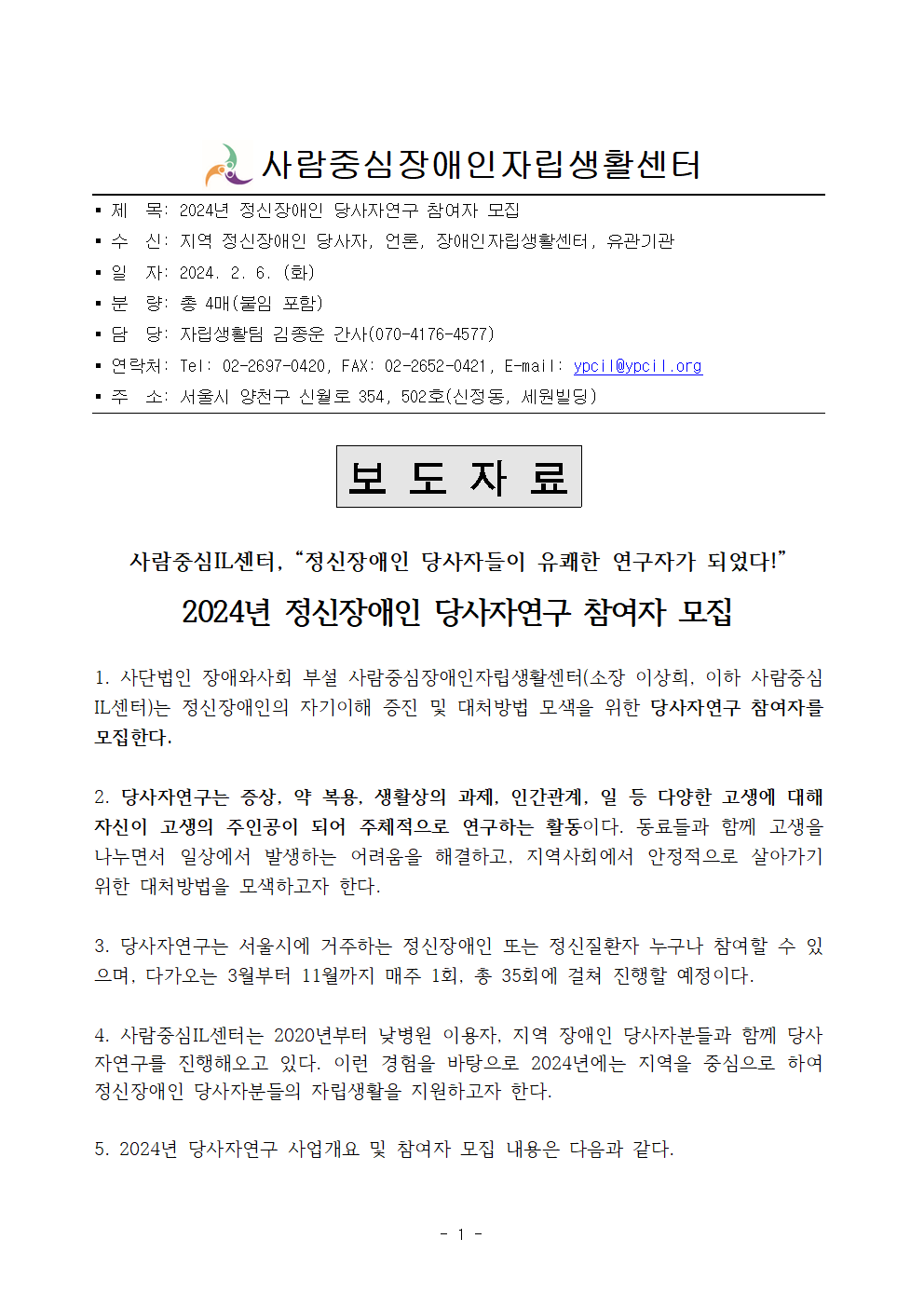[보도자료] 2024년 정신장애인 당사자연구 참여자 모집